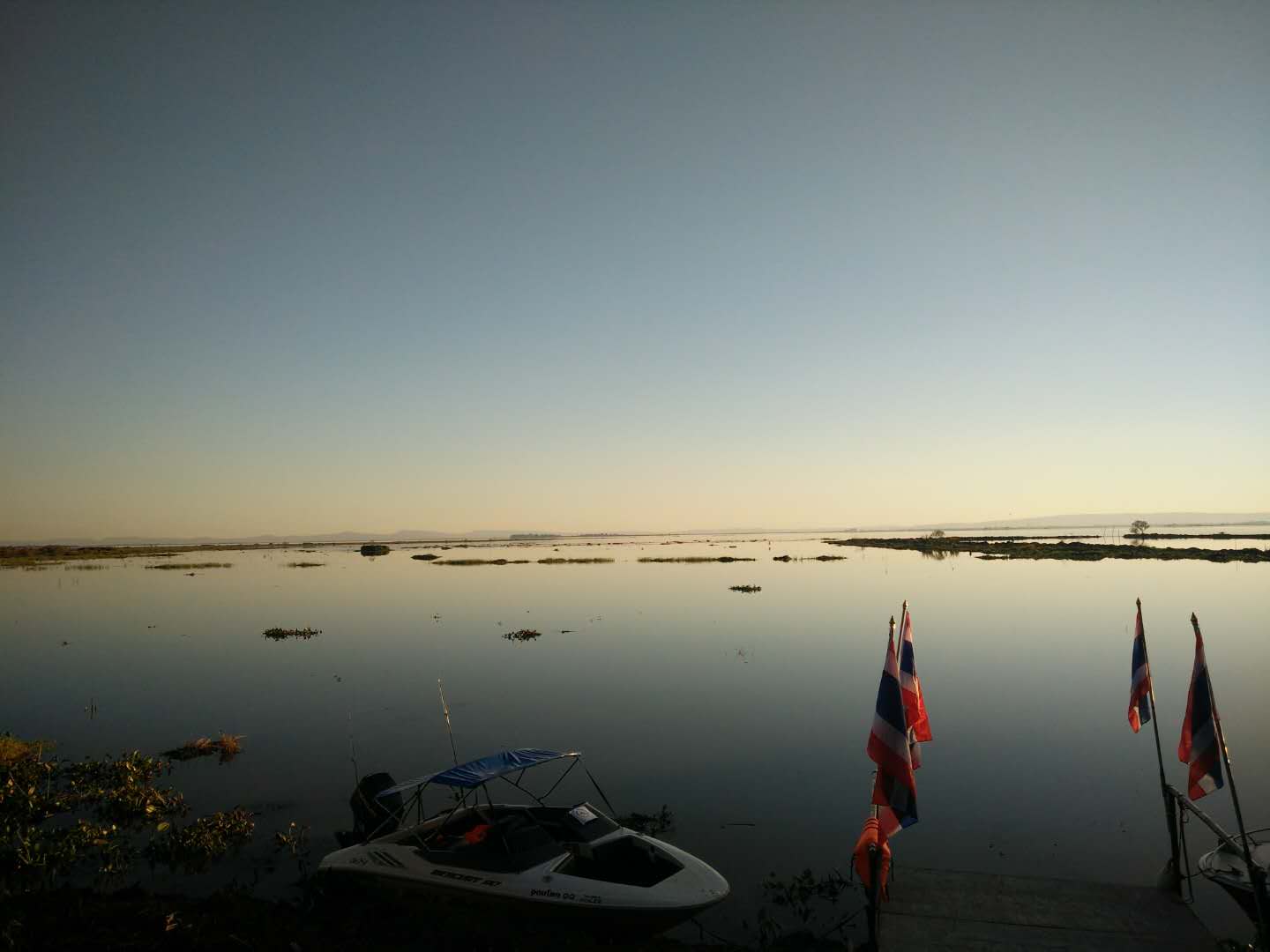 没有曼谷的繁华与拥堵,也没有普吉岛的海风习习,有的是宽阔的马路和路两边的原野,由草绿向麦田黄的颜色的更迭。天空时而湛蓝,时而粉蓝交加,总是布满大朵的云。接近黄昏的时候,泛着红光的夕阳渐渐西沉,晚霞升起,美到不可思议。热季炽热的阳光烘烤着整个大地,雨季瓢泼的雨又会忽然到访,却也会在每次上课之前消停,似乎早就跟我们约定好,不要淋湿赶路的学生们。凉季的夜空布满了明亮的星星,十一月双子座的流星雨给冬季的夜空带来无限的惊喜,站在旧飞机跑道上,向着夜空许下美好的愿望。校园里的行道树,坚守着自己提供阴凉的使命,湖边的龙舟安静地搁浅,和远处的琉璃蓝尖顶高塔一低一高相互辉映。遇到天晴的时候,阳光反射到波光粼粼的湖面,就像是洒了满湖的银粉。夜晚和三两好友相约这里,伴着晚风,望着明月或倾诉或沉思。这里的风景,可以让人沉静下来,因为随手一拍就是一幅画。