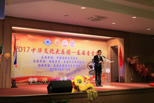 3月19日,由中国海外交流协会、华侨大学和泰国华文教师公会联合承办、泰国东盟普吉泰华学校协办的“2017中华文化大乐园—泰国普吉营”在泰国东盟普吉泰华学校孙斌大讲堂开营。中国驻宋卡总领事馆驻普吉领事办公室副领事李健,泰国华文教师公会主席罗宗正,普吉乐善局主席、东盟普吉泰华学校董事长邢福扬等嘉宾出席活动。